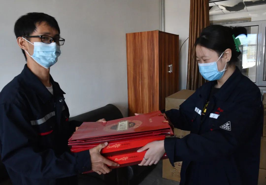 為了做到人員不聚集,大家按部門分批領(lǐng)取,現(xiàn)場不像往常那么熱鬧,但隔著口罩也能看到領(lǐng)取月餅的員工帶著笑意的眼神。在這特殊的日子里,一盒盒月餅飽含著泰和公司對每位員工的深切關(guān)愛和祝福。(白露)