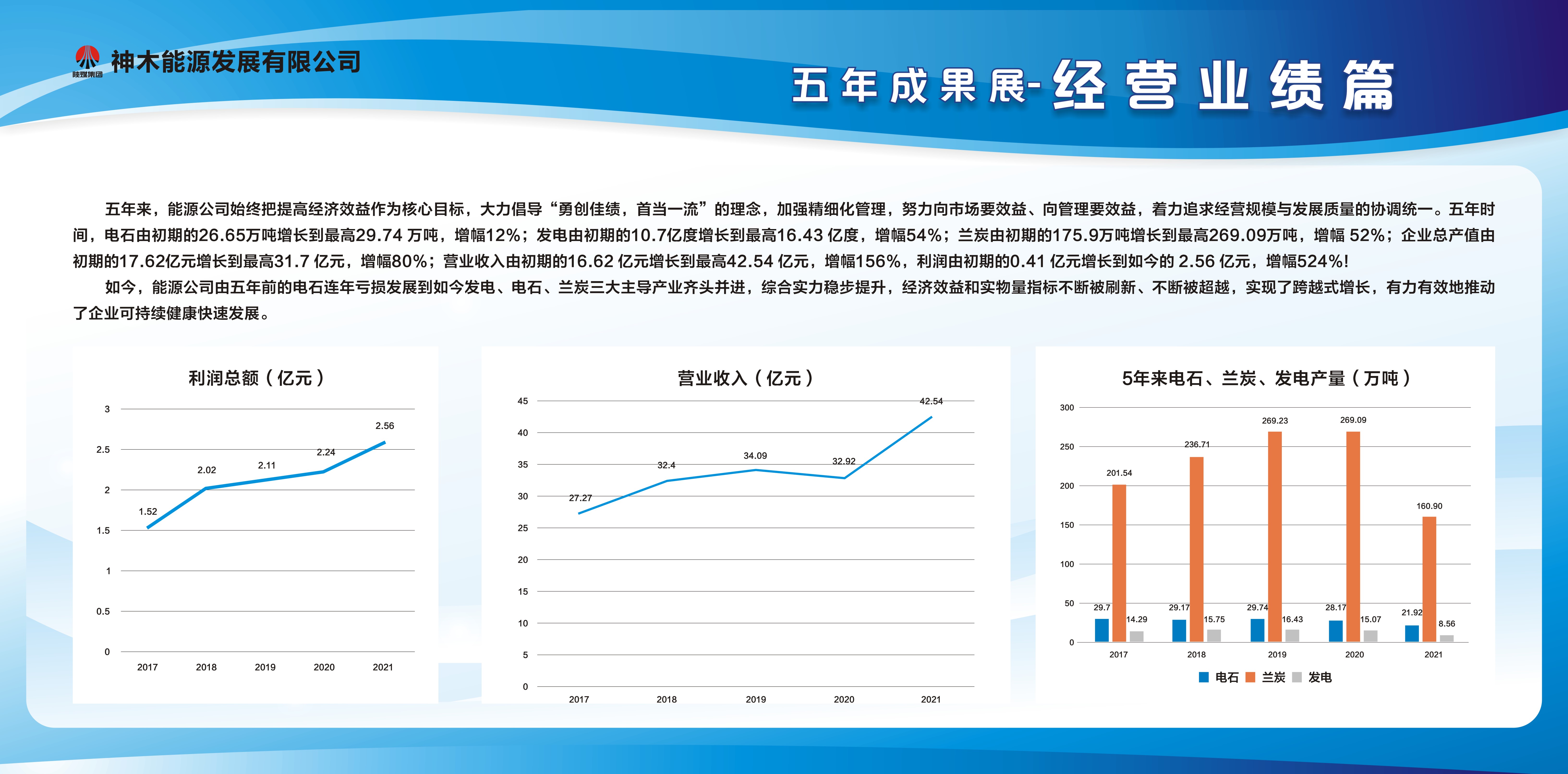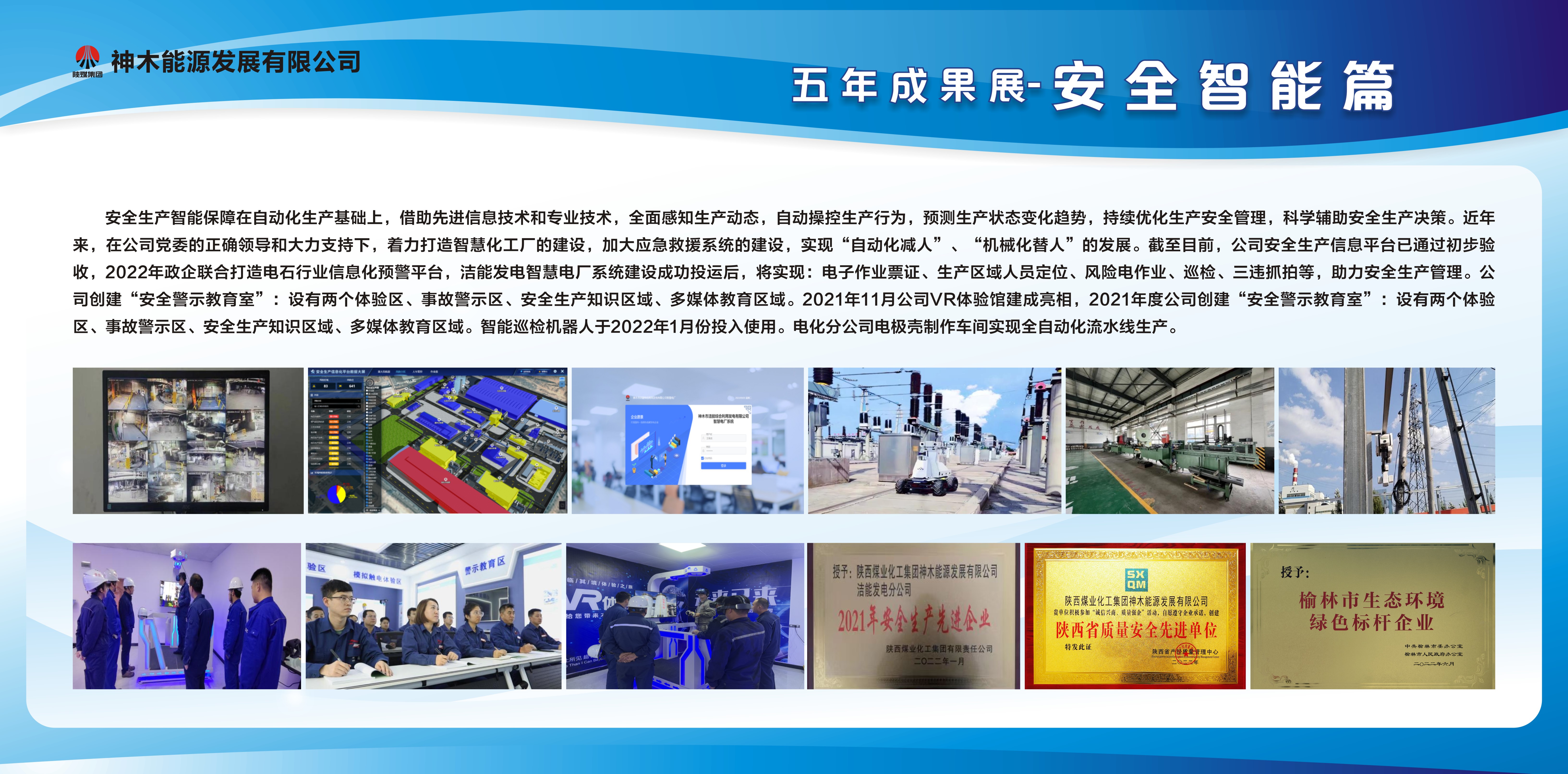 本次成果展生動展現了5年來能源公司在陜煤集團及神木煤化工公司領導下,改革創新、高質量發展的奮斗歷程。整個展覽分為“黨建成果篇”“安全智能篇”“黨風廉政篇”“經營業績篇”“戰略發展篇”“技術創新篇”“職工生活篇”等七大版塊。總結了5年來,在陜煤集團及神木煤化工公司的正確領導下,能源公司踔厲揚帆、礪砥前行,從五年前的電石連年虧損,到如今的發電、電石、蘭炭三大主導產業齊頭并進,再到240萬噸/年蘭炭產業轉型升級的全面完成,以匠心和恒心推動企業前行,助力能源公司高質量發展。