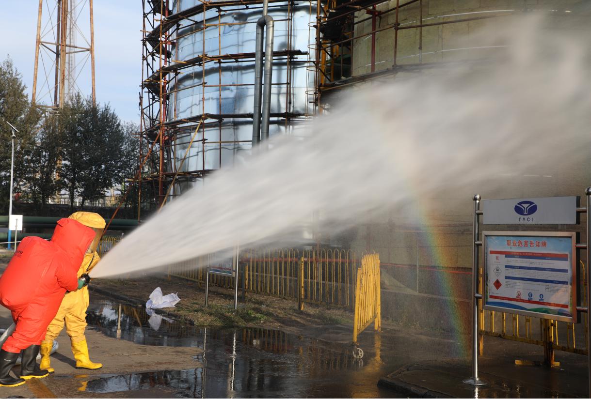 演練前,天元公司作了充分準備,成立了應(yīng)急演練組織機構(gòu),制定了詳細的演練方案,對演習過程進行了桌面預(yù)演,組織車間、班組學習了演練方案,對員工進行了防護用品及應(yīng)急器材使用進行了培訓。此次演練,主要對液氨泄漏事故引發(fā)的人員中毒、環(huán)境污染事件進行現(xiàn)場實際模擬演練,主要步驟包括泄漏預(yù)警、車間處置、公司處置、后期處理及恢復(fù)生產(chǎn)。