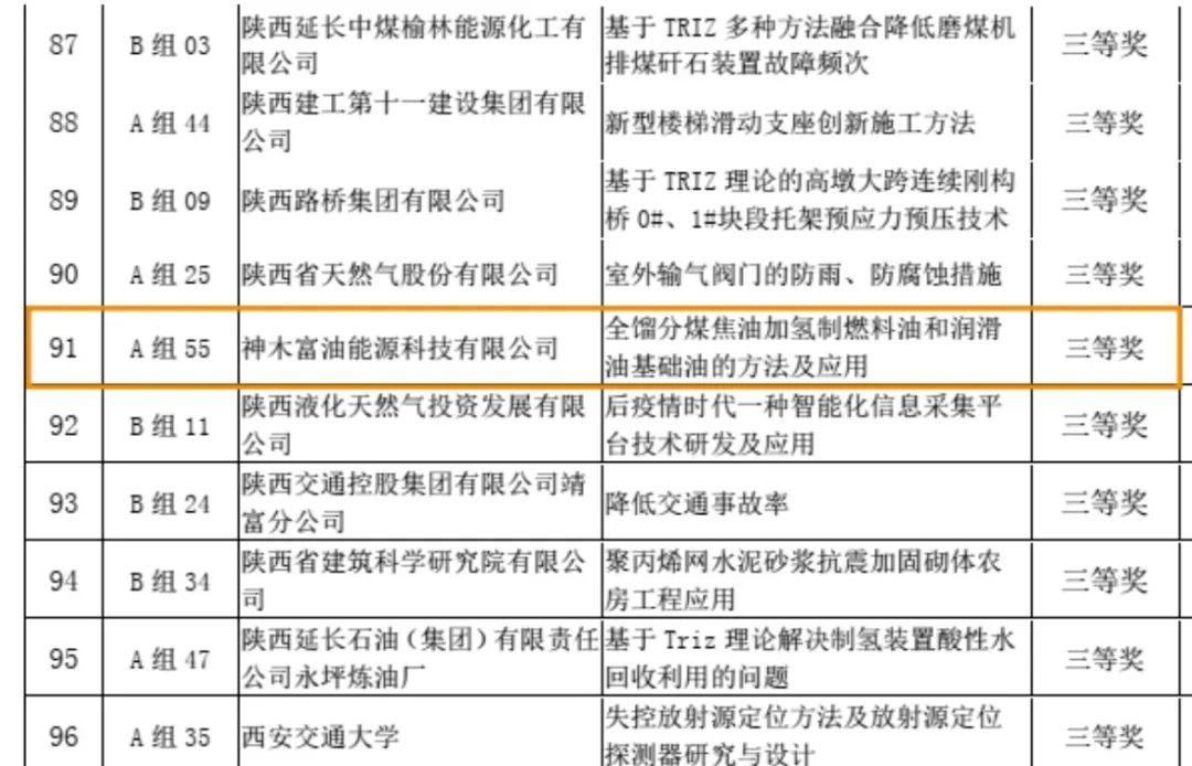 近日,2022 “秦創原?涇河杯”陜西省創新方法大賽評選結果公布,神木煤化工富油公司申報的《基于 TRIZ 創新方法—全餾分煤焦油制燃料油和潤滑油基礎油的方法及應用》的創新方法成果喜獲三等獎。