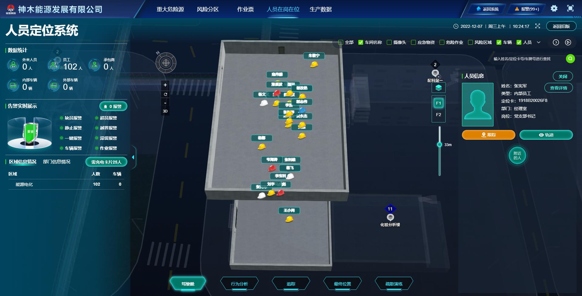 12月7日,神木煤化工能源公司人員在崗在位管理系統正式投入使用。該系統主要包括區域人數車輛統計、人員實時定位、人員歷史軌跡回放、缺員報警、超員報警、靜止報警、越界報警、一鍵報警、滯留報警、車輛報警、作業報警、低電報警、數據可視化展示、數據接口等功能。