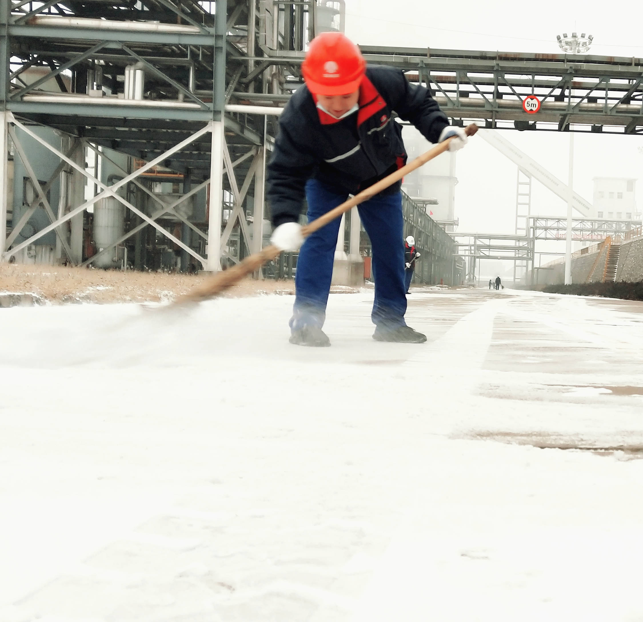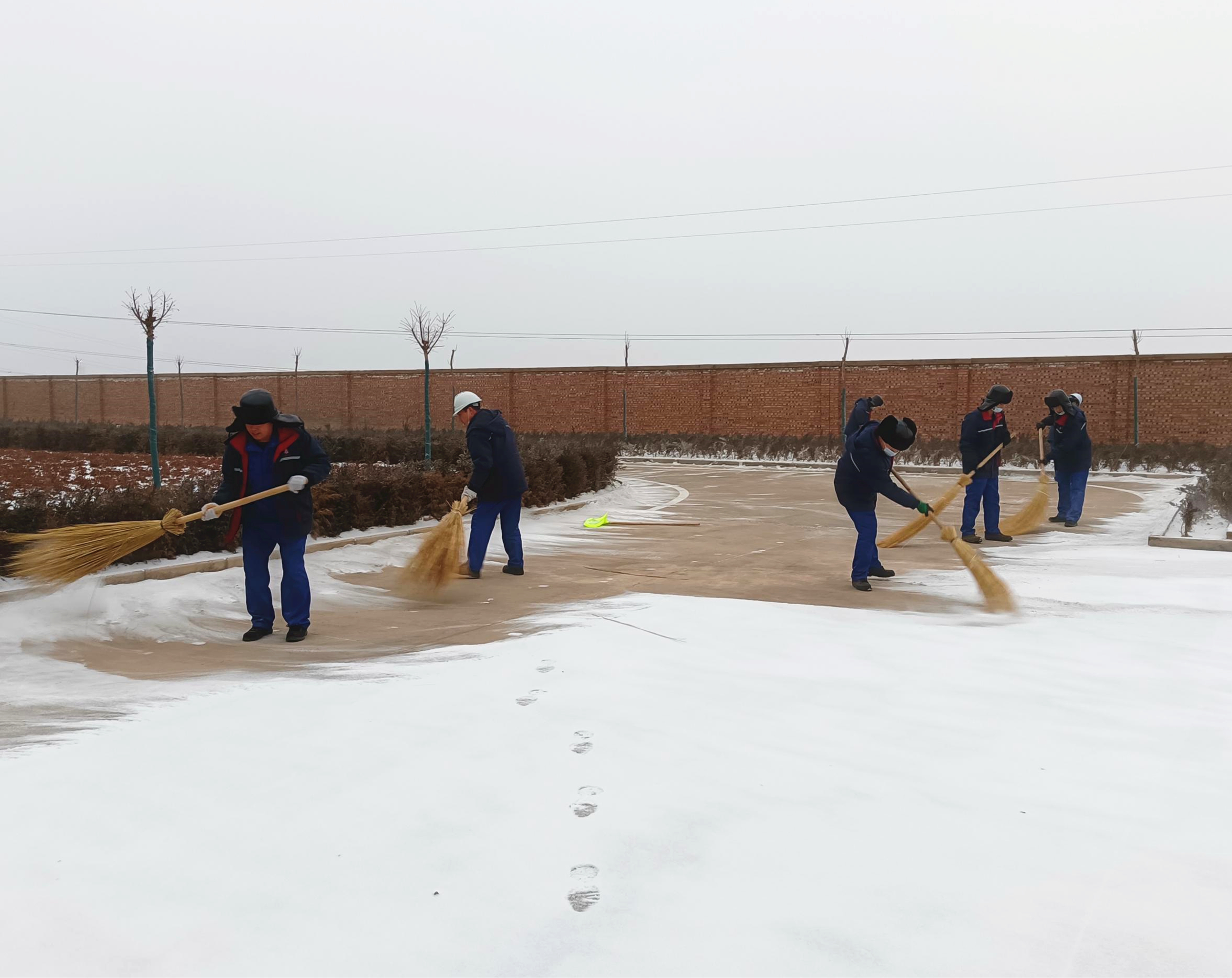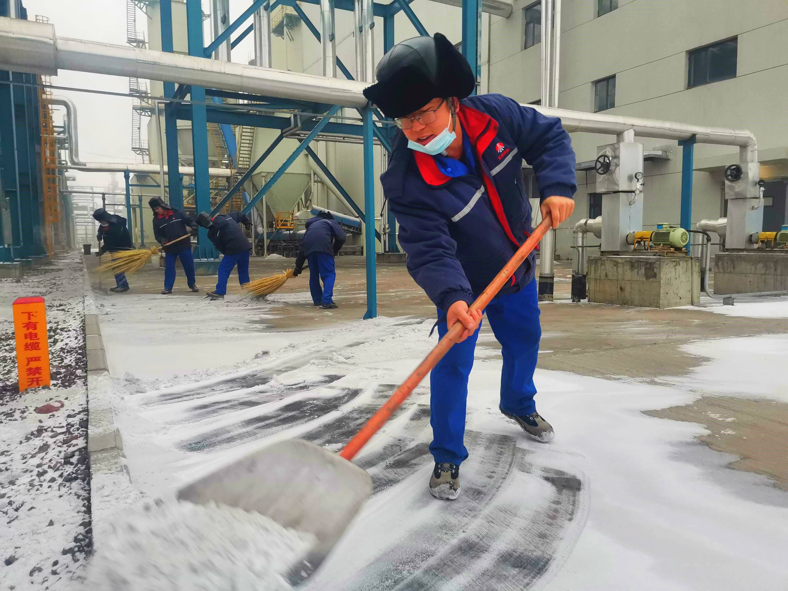 轉瞬間,廠內人潮涌動、響聲四起,大家在低溫中躬著身子頂著寒風, 握著掃帚、拿著鐵鍬,掃、鏟、推,干勁十足。喊聲、笑聲、掃雪聲、鏟冰聲匯成一首和諧美妙的進行曲。經過1個小時地激戰,廠區主干道露出了真容,雪后的廠區顯得格外清新潔凈,員工和車輛出行方便自如。