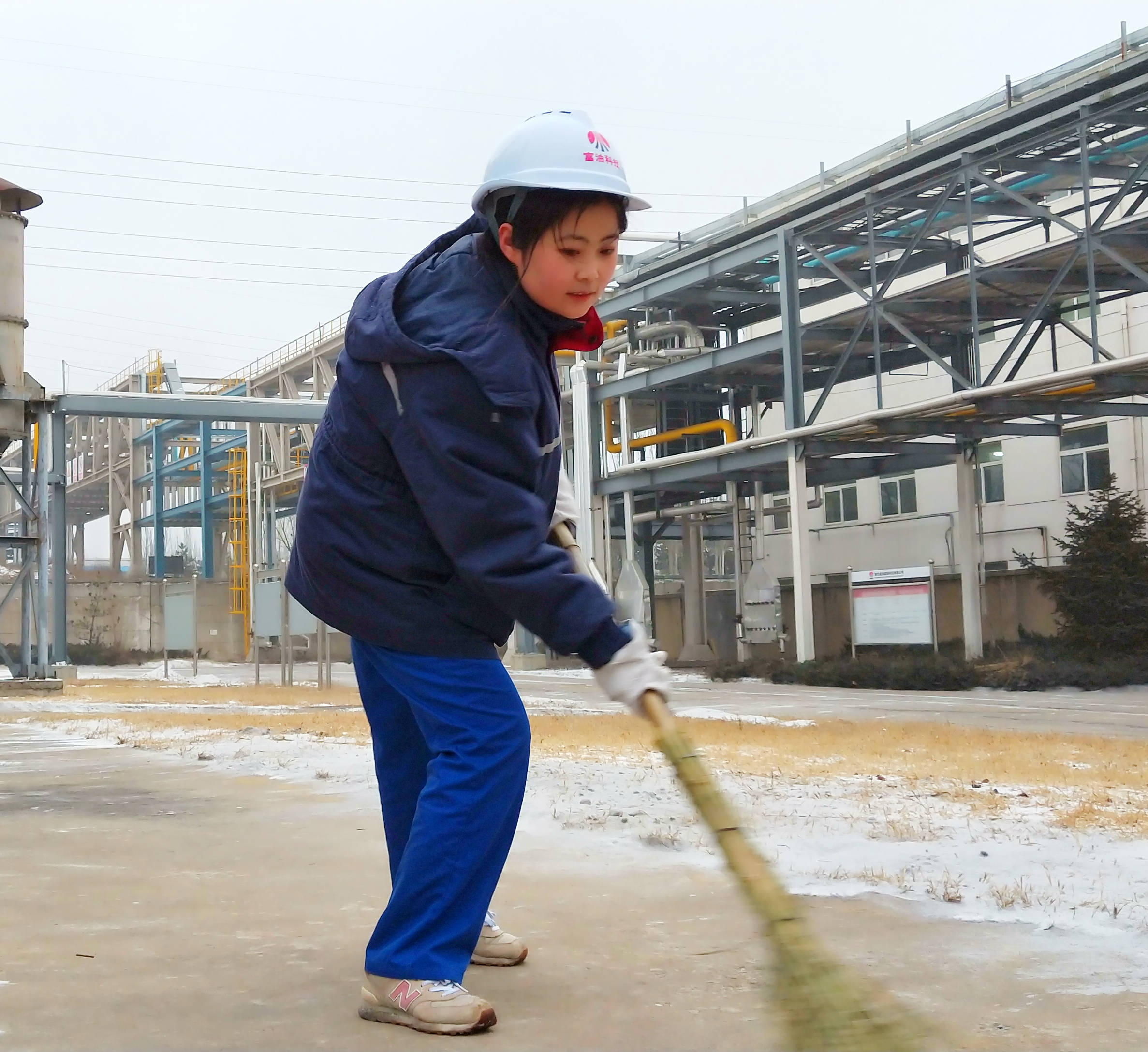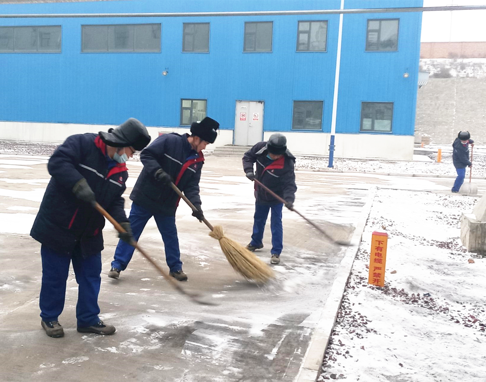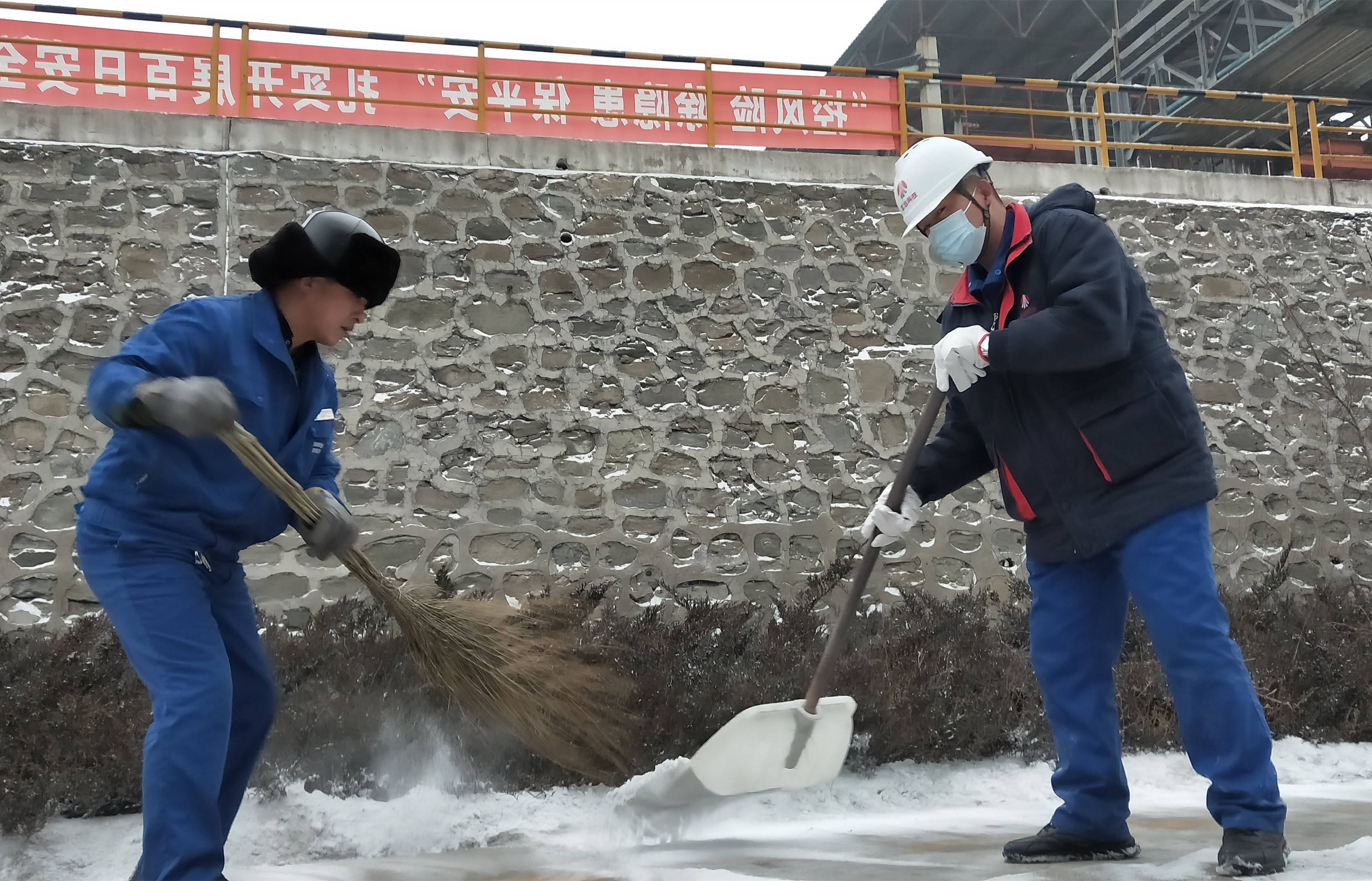轉瞬間,廠內人潮涌動、響聲四起,大家在低溫中躬著身子頂著寒風, 握著掃帚、拿著鐵鍬,掃、鏟、推,干勁十足。喊聲、笑聲、掃雪聲、鏟冰聲匯成一首和諧美妙的進行曲。經過1個小時地激戰,廠區主干道露出了真容,雪后的廠區顯得格外清新潔凈,員工和車輛出行方便自如。