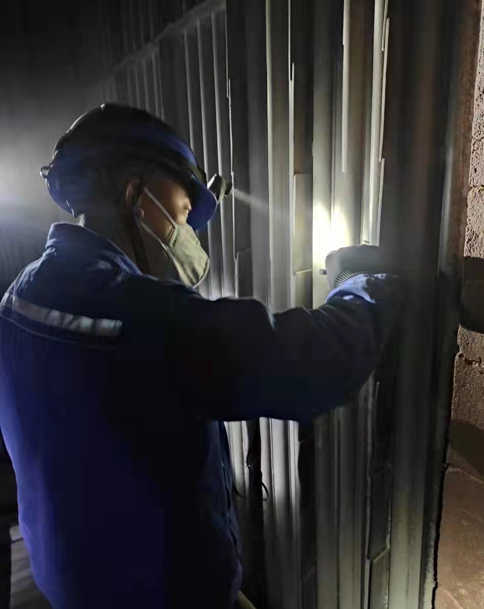 防磨防爆檢查歷來都是檢修工作的重中之重。熱電分廠臨時成立的運行突擊隊的工作人員穿上工作服、戴好防塵帽和口罩等裝備,仿佛“太空人”一般從狹小的人孔門進入爐膛。從再熱器冷段到省煤器,從水冷壁斜坡墻到爐頂,從過熱器到頂棚穿墻管,運行突擊隊工作人員對每一根管道、每一處焊口、每一根管卡都進行了細致入微的檢查和標記,不放過任何一個死角。檢查過程中,大家克服了爐膛內部塵埃懸浮、呼吸困難,高空作業、空間狹小等重重阻力,不斷穿梭于爐膛內部汽水管道之間,攀爬于腳手架之上,一絲不茍地查找爐內管道缺陷,發現問題匯報、總結,及時處理問題,這樣就可以避免機因水冷壁、空預器等泄漏而發生的停爐事件,為保證機組安全穩定運行奠定基礎。