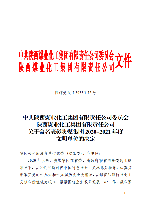 近日,陜煤集團召開文明單位、勞動模范和陜煤工匠表彰大會,神木煤化工電化公司榮獲陜煤集團2020—2021年度文明單位,標志著公司精神文明建設工作取得新的成果。